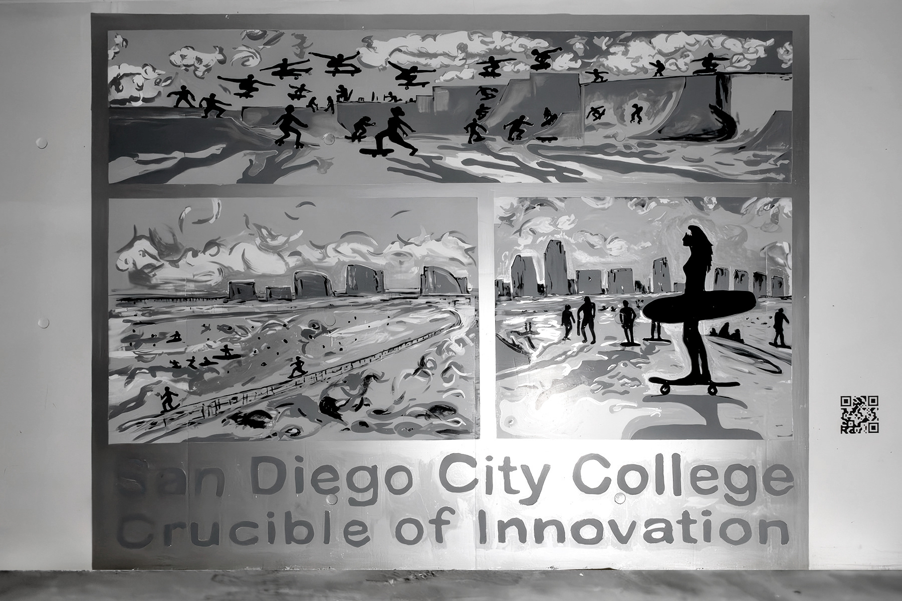 This permanent mural for the Arts and Humanities building parking garage at San Diego City College reflects how the climate and culture of San Diego influenced the development of the skateboard community here. The practice arose in this locale from surf culture, as an activity for surfers to ride concrete boardwalks when the ocean was still. It incorporates roller skating wheels with small board-like platforms. Each of these communities foster aesthetic and athletic development, encourage autonomy and inclusivity, and provide connections to networks of friends. This work also references the Light and Space Movement, a practice originating in Southern California environments in which spatial volume and lighting conditions are the medium itself. Hence, reflective paint was chosen for the ways in which it shifts perceptions, as car headlights and pedestrians pass through the space.