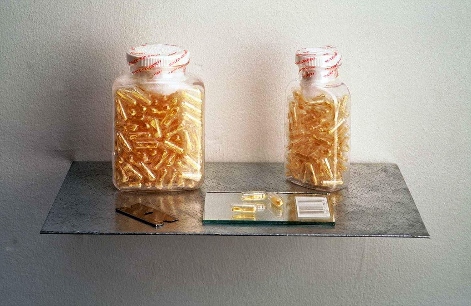 Pablum, 1992, 6 x 6 x 12 inches, vials of yellow bows in medicine capsules, with razor and bar code on mirror