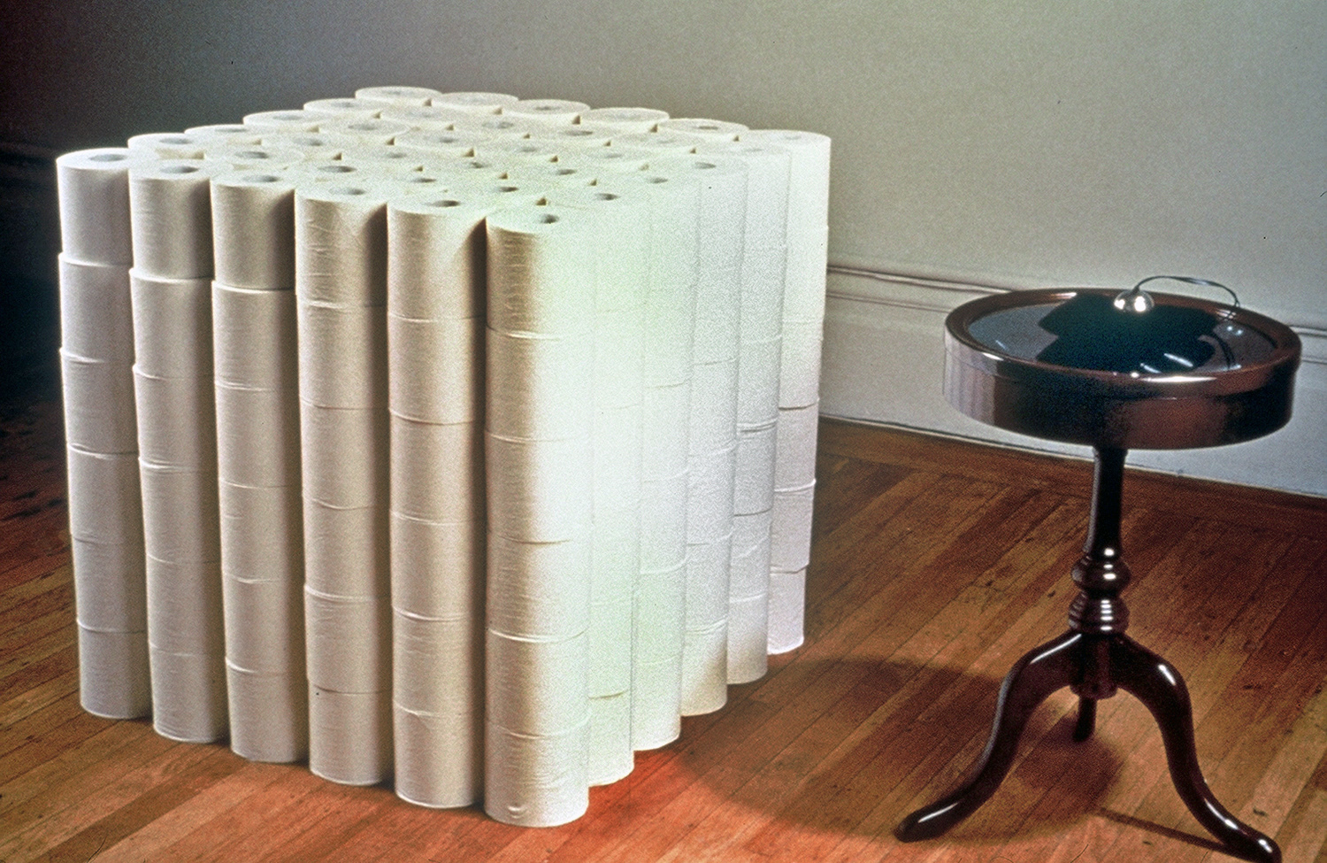 Market Niche, 1992, 8 x 4 x 3 feet, minimalist cube of toilet tissue and Victorian vitrine containing sex toys