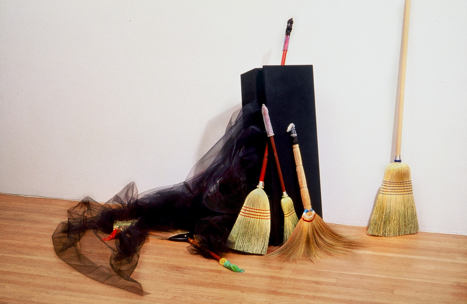 Sweeping Generalizations, 1992, 8 x 4 x 5 feet, child's casket, brooms and condoms