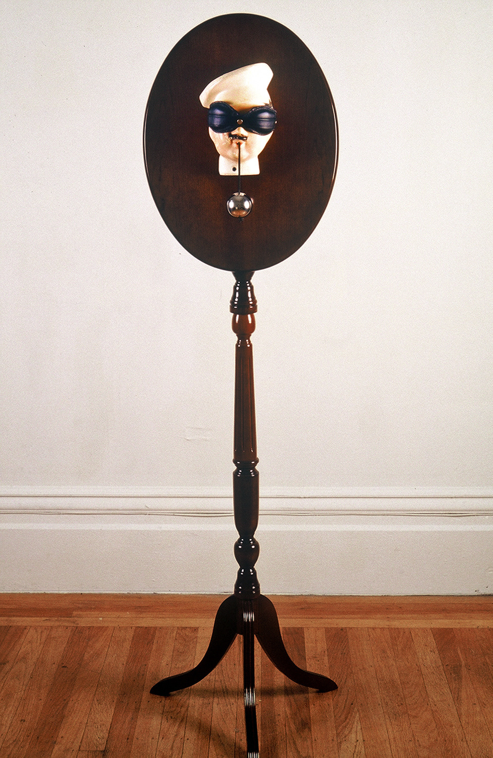 Balancing Priorities, 1992, 3 x 3 x 6 feet, Elongated game table, chrome Ben Wah ball, leather mask and plaster bakery string dispenser