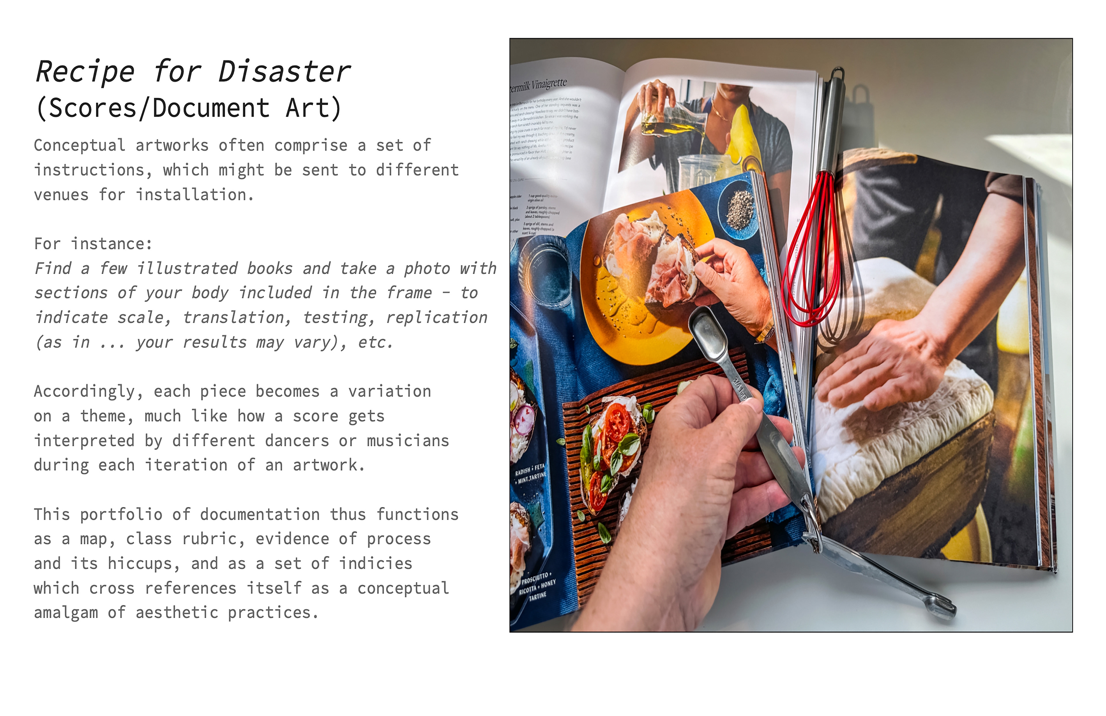 This series reconstitutes the process of documenting art class assignments into slippery forms of evidence. As breadcrumb-strewn pathways, the works suggest speculative versions of the art making process which might generate new outputs. Interpreted like musical scores and relayed like a children's game of "telephone," these elastic diary entries morph and adapt according to each successive participant's reading and implementation of them.